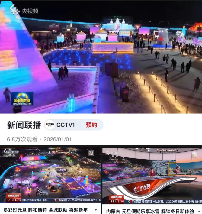 以“冰雪+非遺”為主題的跨年、元旦聯(lián)歡活動還受到中央廣播電視總臺CCTV-1《新聞聯(lián)播》欄目報道。此外,央視《新聞直播間》《朝聞天下》等品牌欄目也對活動予以報道,并在央視新聞客戶端開展專場直播。8次央視新聞聚焦,10余家央級媒體、多家省市級主流媒體及主要商業(yè)平臺發(fā)布相關(guān)報道近千篇,形成多層次宣傳格局,將呼和浩特歡樂冰雪節(jié)推向全國視野。