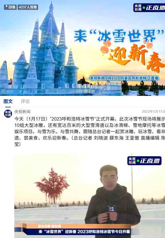 活動(dòng)期間,央視《新聞直播間》于大年初一進(jìn)行長(zhǎng)達(dá)7分鐘的專(zhuān)題直播,呼和浩特歡樂(lè)冰雪節(jié)從首屆起便獲得了國(guó)家級(jí)媒體的高度關(guān)注。